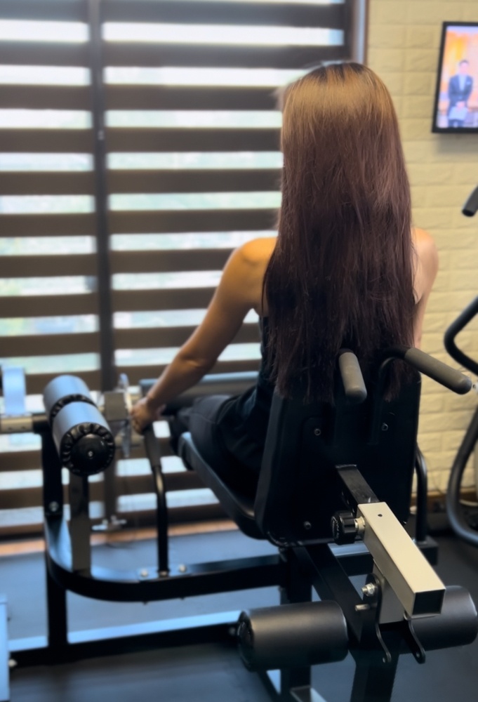 うつ伏せになり、レッグパッドに掛けた脚を臀部まで巻きこみます。